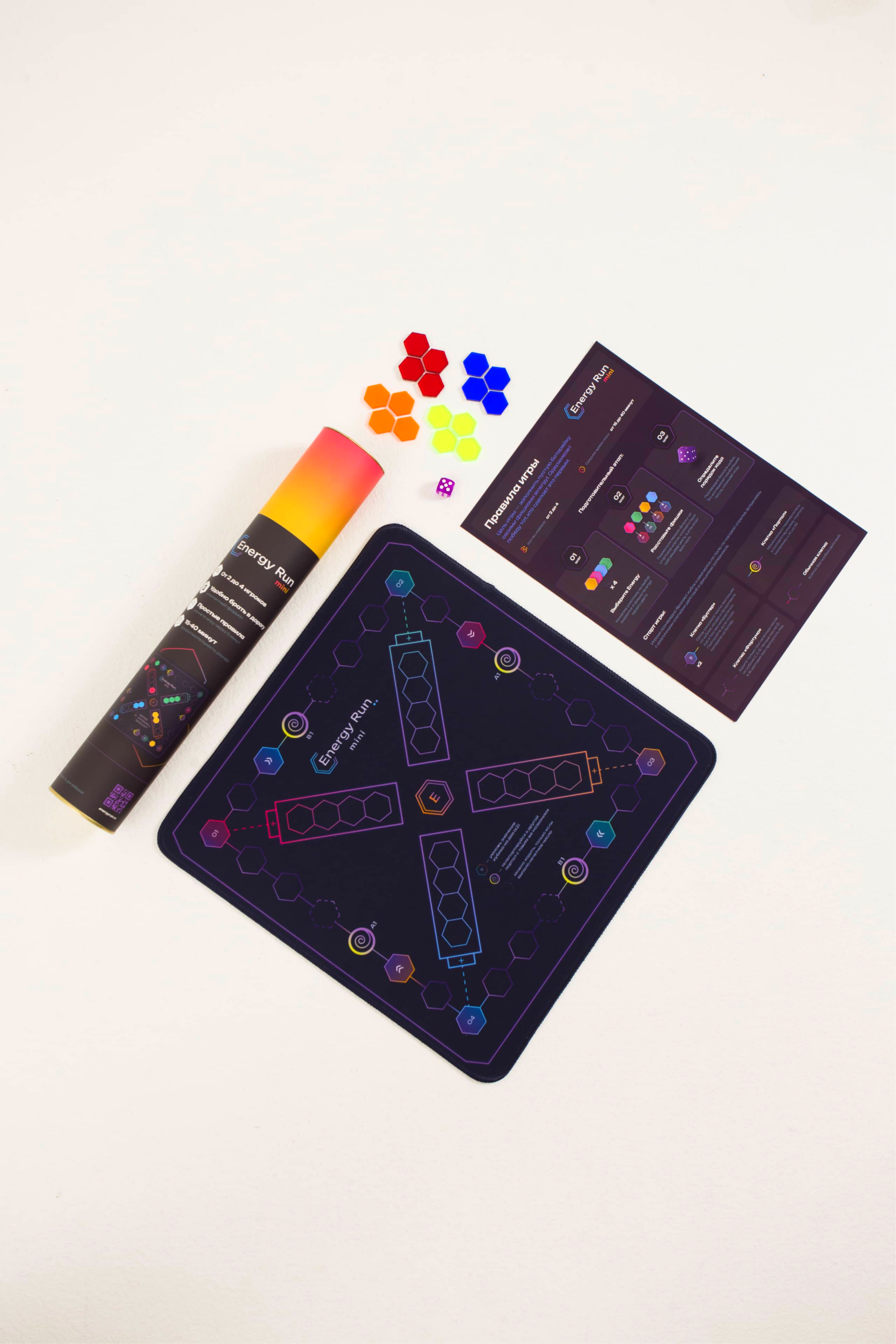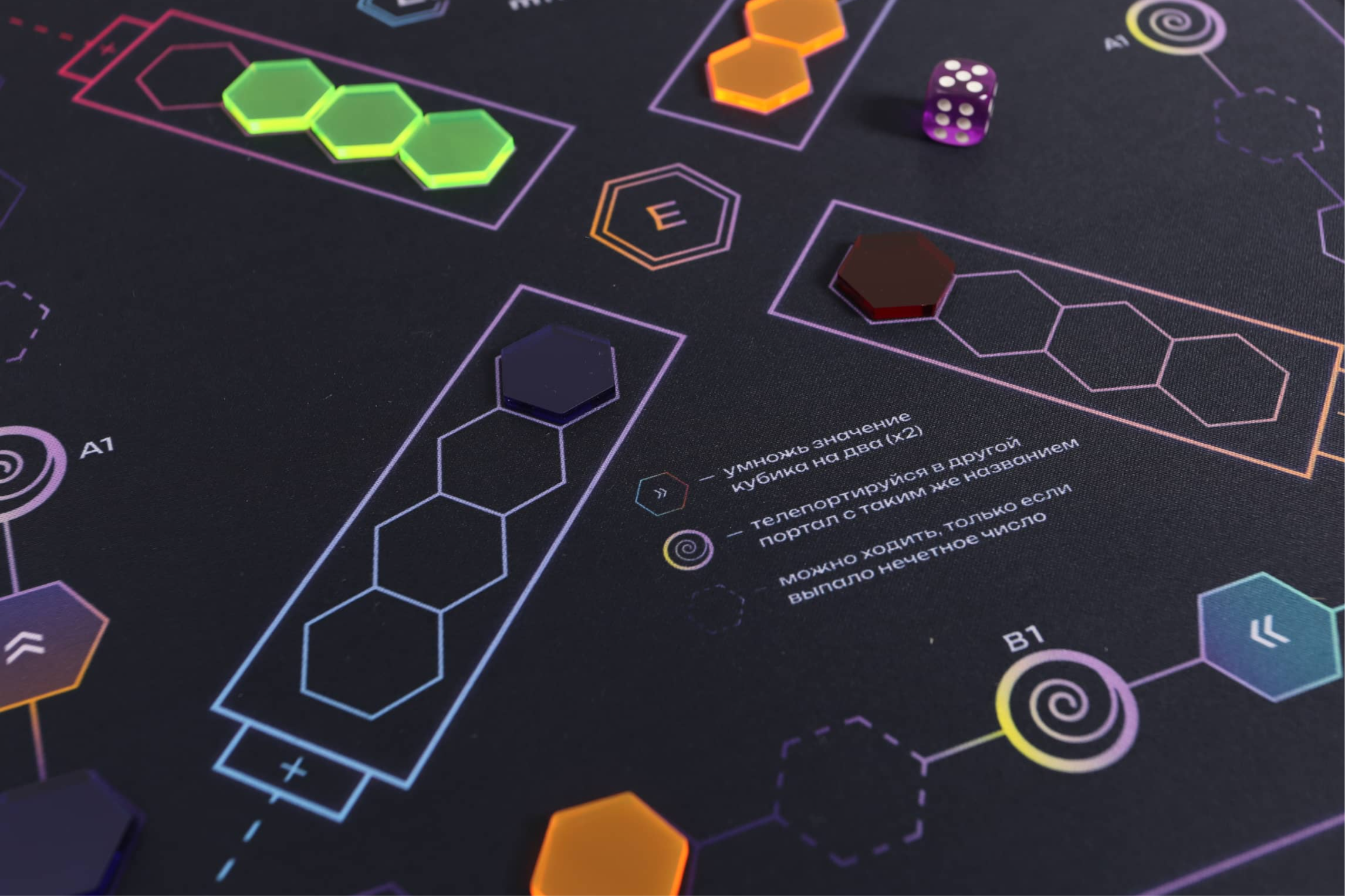 – Игровое поле выполнено из высококачественной прорезиненной ткани размером 35×35 см, напоминающей коврик для мыши, но гораздо большего размера. Фишки сделаны из прочного люминесцентного материала, который создаёт эффект свечения при определённом освещении.